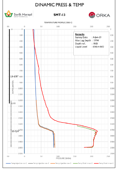 2023年6月7日,SMGP鉆井和資源團(tuán)隊(duì)對(duì)耗時(shí)27天、于6月6日完井的T-13井進(jìn)行了完井測(cè)試。測(cè)試數(shù)據(jù)顯示:T-13是一口高溫、高流動(dòng)性的生產(chǎn)井,成功打出了因T-11修井失敗而損失的熱源。該井吸水指數(shù)在54.76kg/s/bar到94.12kg/s/bar之間,在停止注水后4.5小時(shí)后井下最高溫度即錄得217.9℃。其生產(chǎn)層穩(wěn)定在300℃的情況下,該井預(yù)計(jì)可生產(chǎn)190噸/小時(shí)的高壓蒸汽。