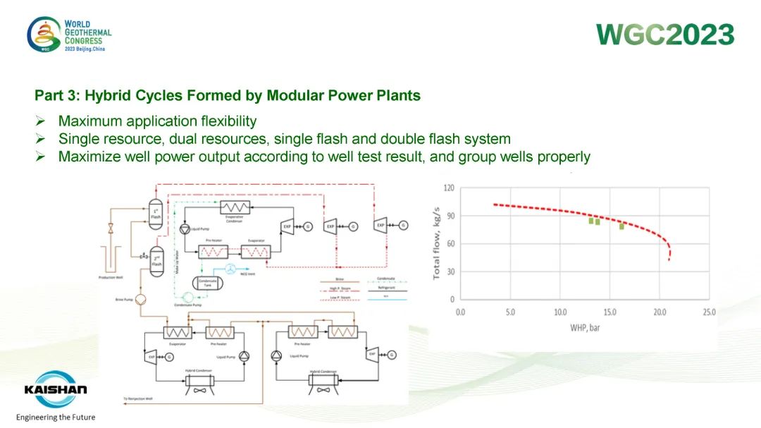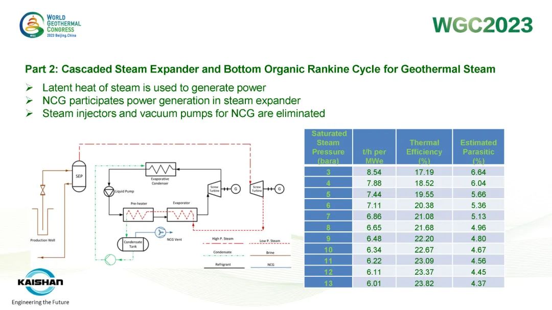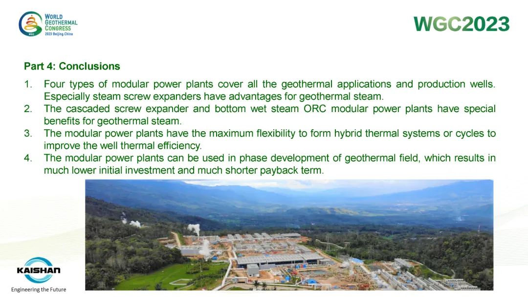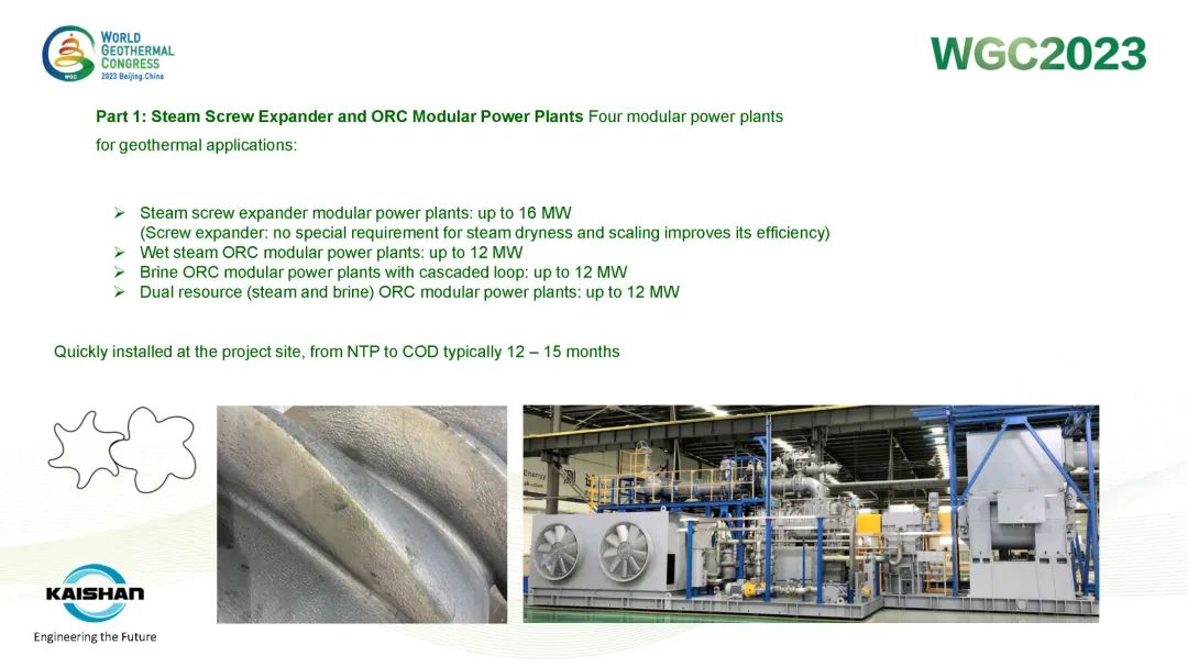 湯炎博士在報告中指出,地熱開發應最大限度提高井的發電量,避免產生低壓井或閑置井。開山成功開發的蒸汽螺桿膨脹機模塊電站、蒸汽ORC模塊電站、鹽水ORC模塊電站和“蒸汽+鹽水”模塊電站可根據不同溫度、壓力的地熱資源提供最靈活、高效的熱力循環系統,最大限度提高地熱井功率輸出。